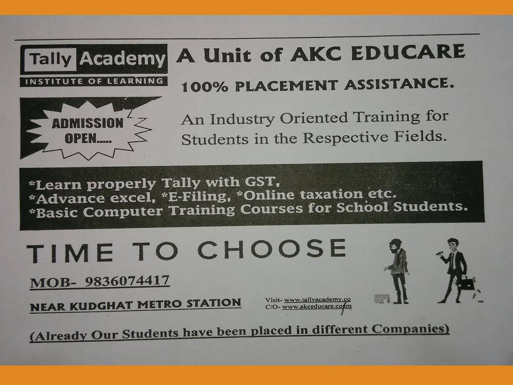 Established in 2005, Tally Academy, India’s one of the most Reputed & Renowned Skill and Talent Development Brand, Tally Academy is an Autonomous Institution Registered Under Public Charitable Trust Act 1882,Govt. of India ( Reg. No. IV-190302550) is also Society Registered (Reg. No. S/2L/47695) W. B. Act XXVI of 1961 .